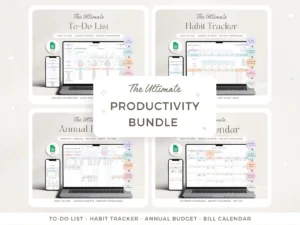 Let’s get productive with our Productivity Bundle for Google Sheets! The bundle includes a to-do list, habit tracker, annual budget planner, and a smart bill calendar. Easily see your yearly budget overview and track your finances on a bimonthly and monthly basis, plan out your weekly and monthly tasks, organise your to-do list, and monitor your upcoming bills!